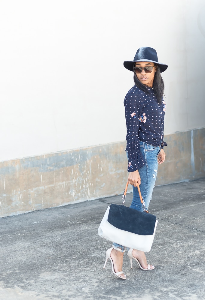 I have been searching for cute tops to wear, and went ahead and bought this one for our denim and blue day at work a few weeks ago. I have honestly had this blouse on repeat, and it was really embarrassing when a client came up to me and said “OMG! I bought that top the other day when you was wearing it”, and I was wearing this same blouse again. I bet she thinks I wear the same thing everyday now! Oh well, when you like something you stick to it right?! The blouse is sheer, but not to sheer where you would need a cami underneath. I love the white raised dots, and of course the bell sleeve which is so on trend right now.