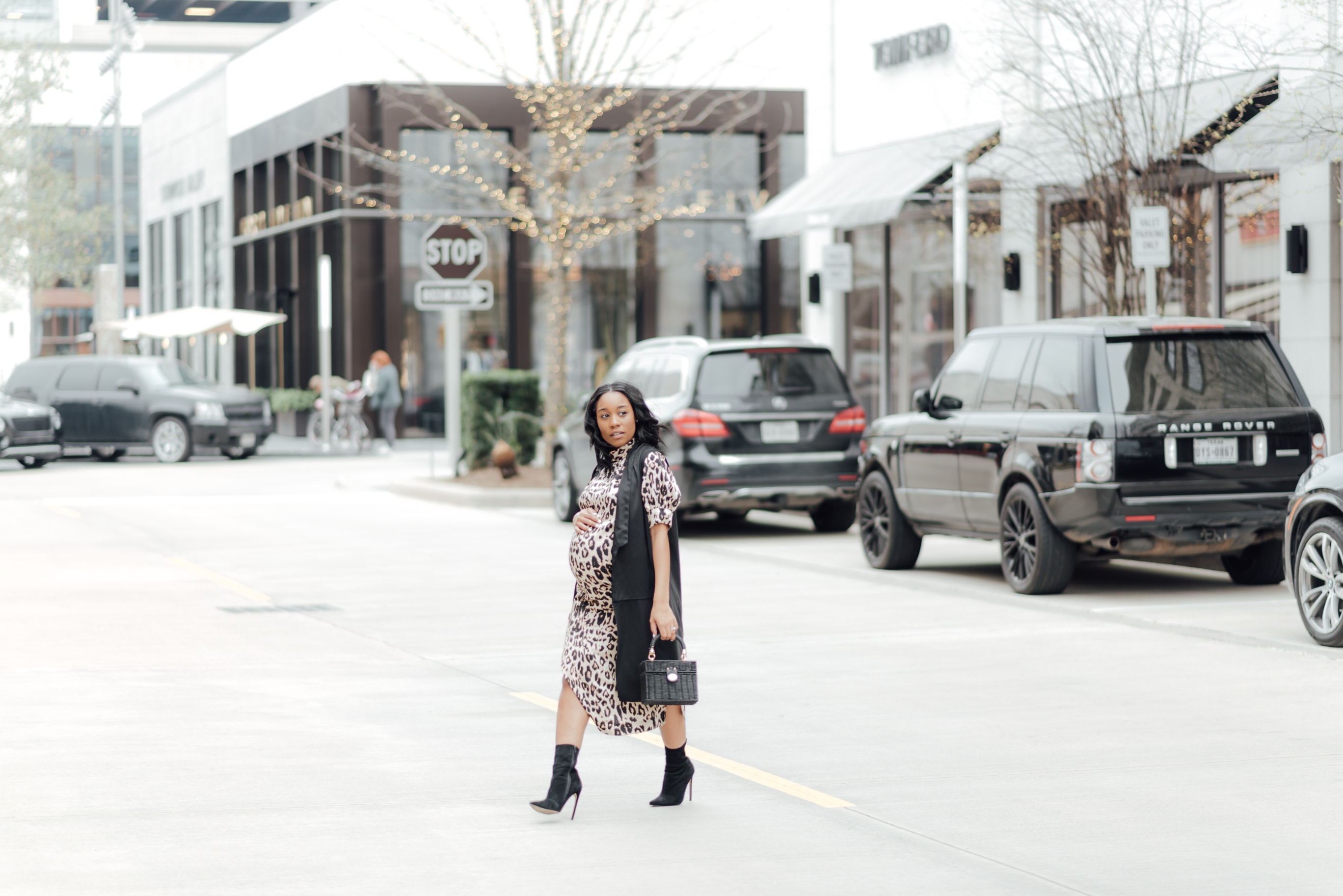 I was hesitant to buy this leopard dress at first because it was a bit bold, but I wanted to make a statement. We can wear prints and patterns with our bumps. Its all about how you style it. I paired this super cute animal print dress with a blazer vest to hide my but and backside. I think it tones down that double bump look which may be a little much when wearing a bold print. You have probably seen me wear this exact blazer vest here, but it has been a life saver during pregnancy. This dress is non maternity and is under $40 which is perfect, so you aren’t splurging. I went up a size and it fit perfectly around my bump. I will be able to transition this look into my non maternity wardrobe after pregnancy, which makes me feel better that I didn’t waste any money.